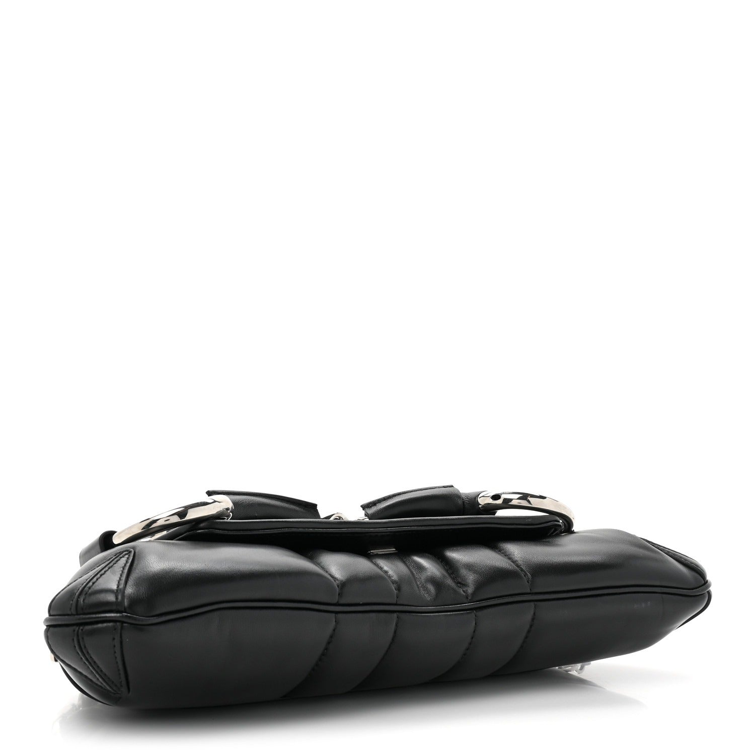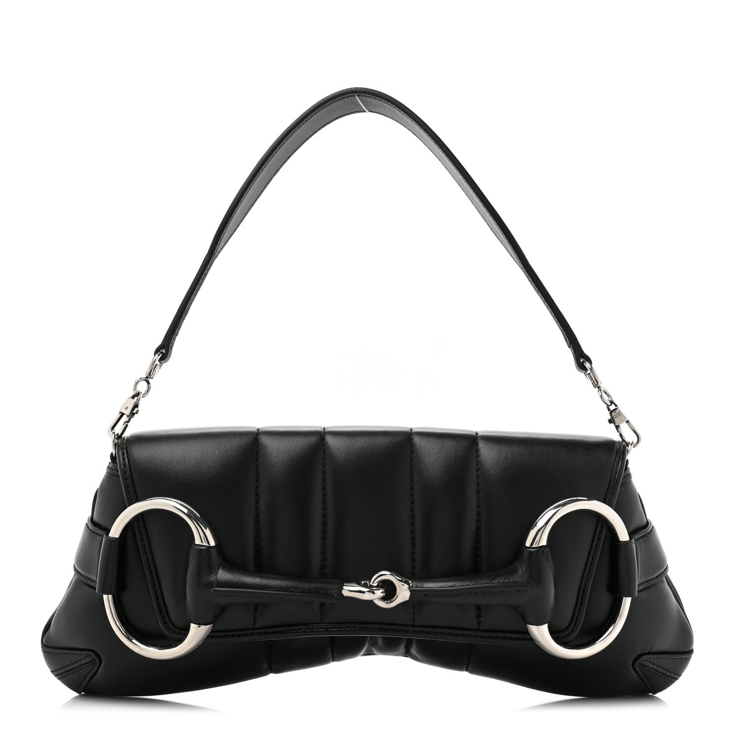 This is an authentic Horsebit Chain Shoulder Bag in Black. This stylish shoulder bag is crafted of beautiful nappa leather featuring a looping leather shoulder strap, an optional shoulder strap, and silver horsebit detail. The top flap opens to a black satin interior.