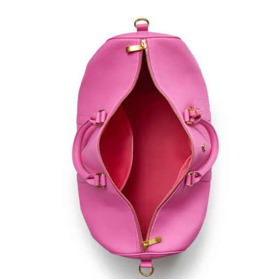 This chic duffle is the final word on refined luxury. Made of vegan pebble leather, this TSA-approved carry-on offers an oversized zip pocket and a generous main compartment. Carry crossbody style with a detachable strap or by its top handle. This travel star is finished with structured lines and decadent gold hardware.