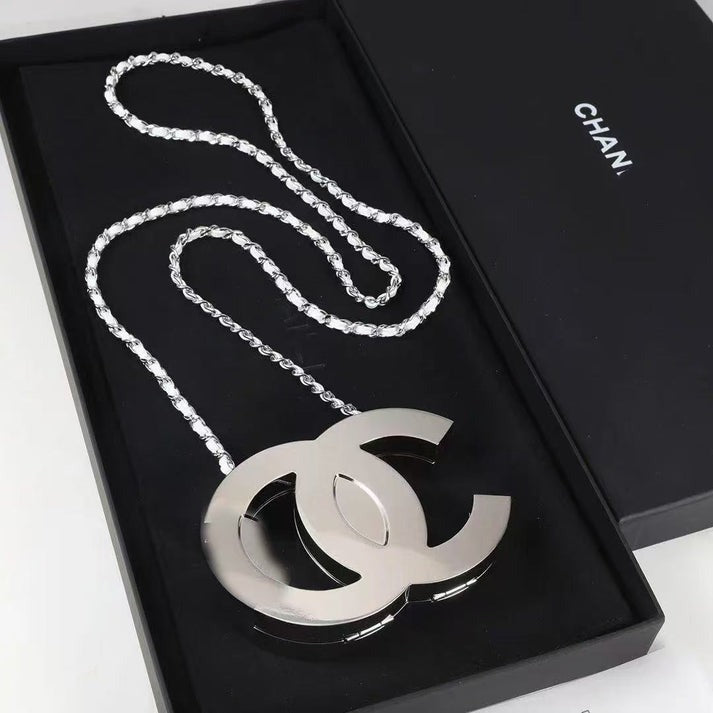 Interlocking double-C pendant in polished metallic finish. A statement piece that exudes timeless luxury, crafted with a sturdy chain and secure clasp for comfortable wear. Perfect for elevating evening outfits or adding a chic touch to everyday looks.