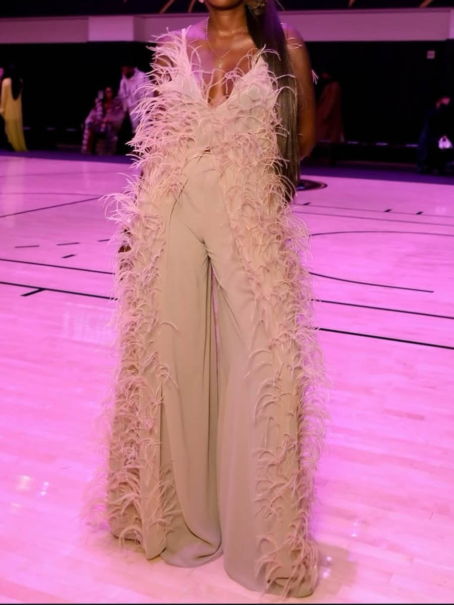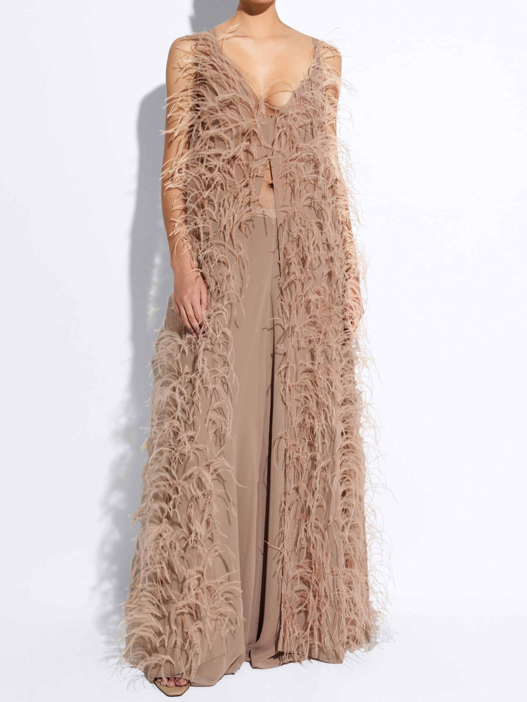 - This Feather Deep V Neck Slit Hem Top in our sheer, lightweight georgette fabrication features hand embroidered feathers throughout with a V-neck in the front and back. This style is Intended to fall at a maxi length.