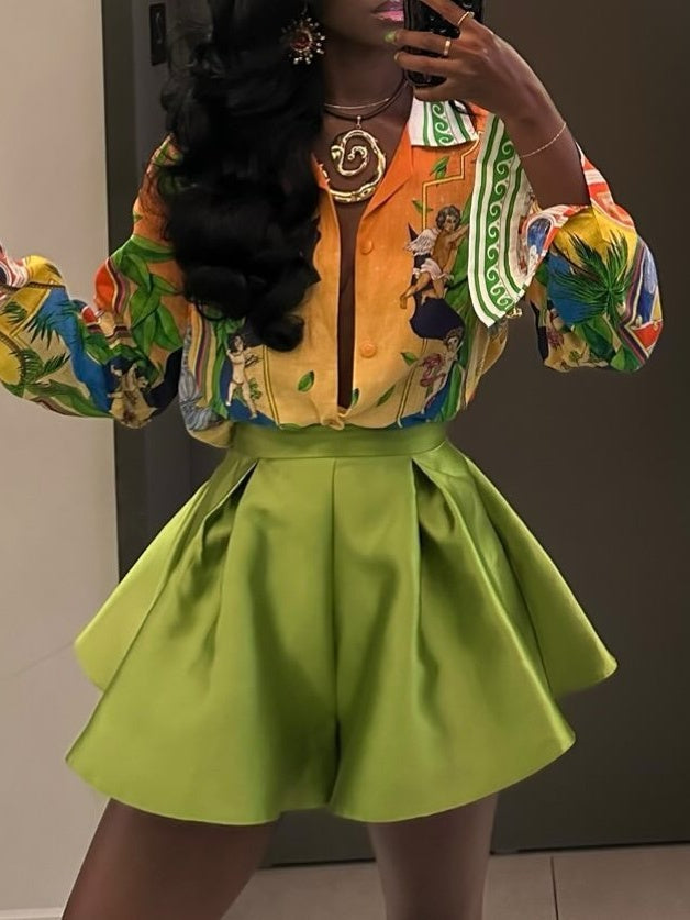 Linen Long-sleeve Shirt + Green Satin Shorts