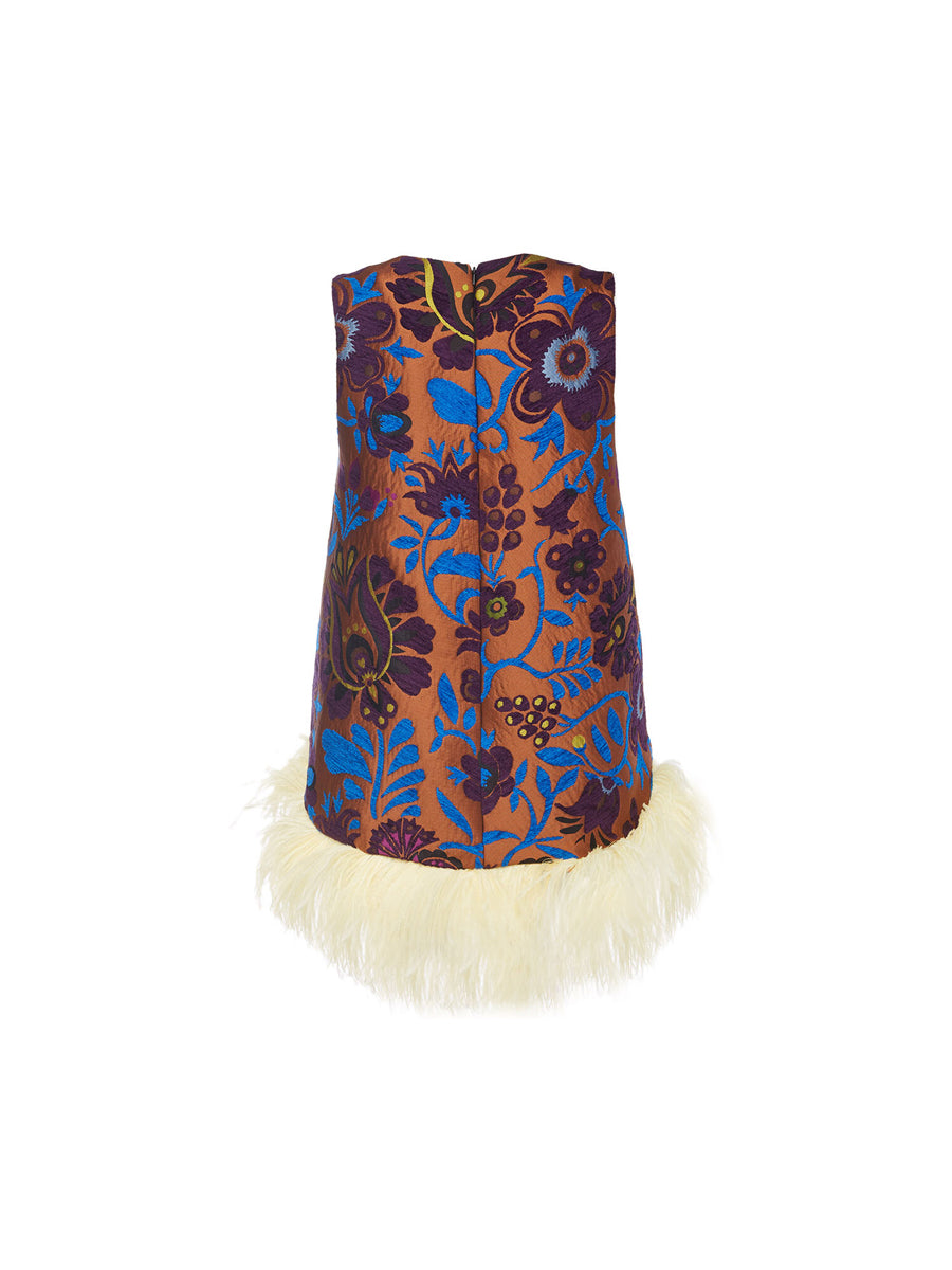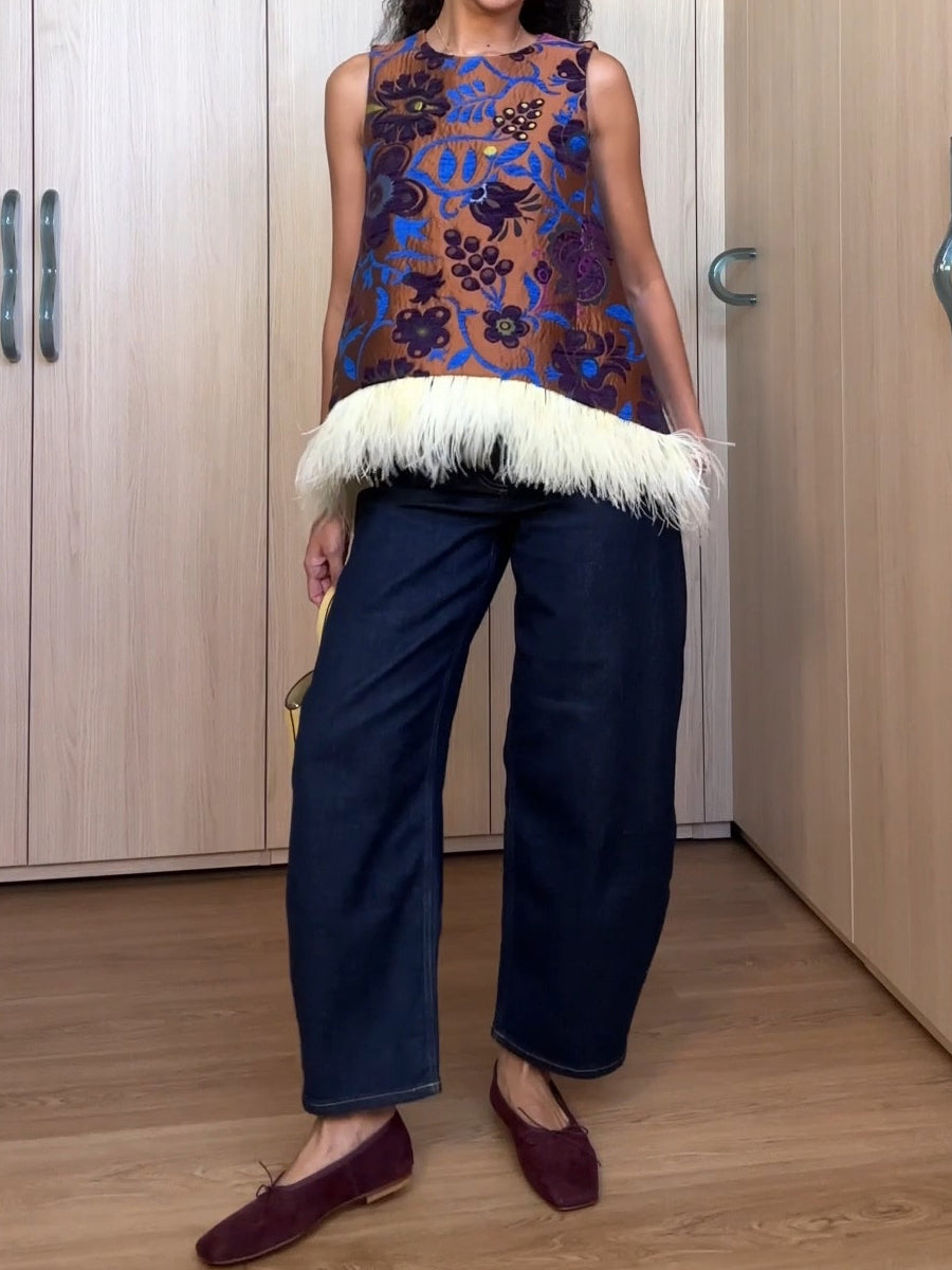 As far as interesting silhouettes go, the Printed Sleeveless Feather Trim Top top may win the gold star. Prime for summer weddings, black tie beach parties and beyond, the alluring trapeze silhouette is crafted in our shimmering new Gyn jacquard and hemmed with a fabulous feather trim. Undoubtedly dazzling styled with the stunning Pencil Skirt to match, we also love it with denim cut-offs for a maximalist gelato run moment.