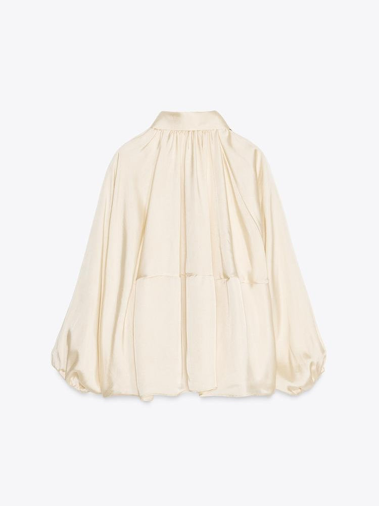 Bomber jacket made of lyocell yarn. Lapel collar and long puffed sleeves. Puffed hem with pleats. Front zip closure.