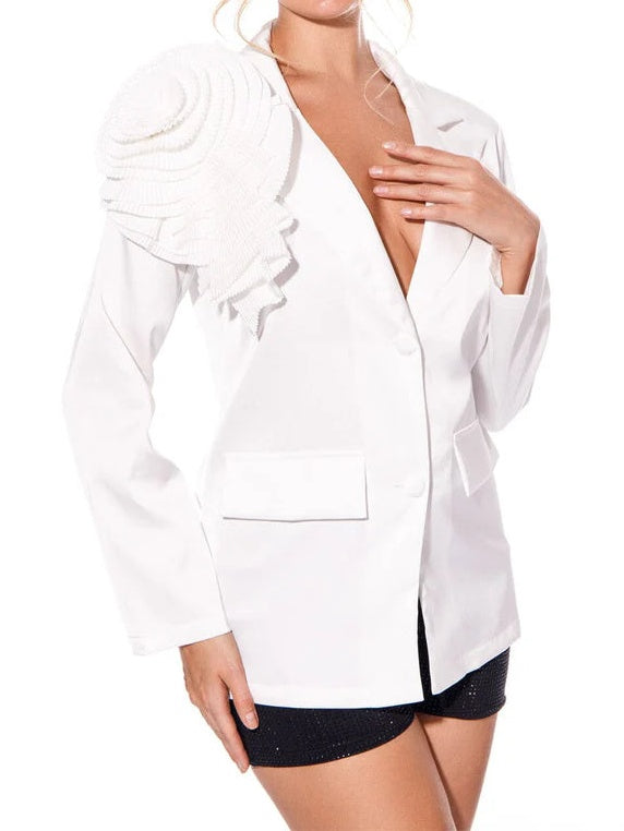 Highlight your look with this gorgeous satin style blazer which features a collared neckline with notched lapel, long sleeves, double button front closure, faux front pockets and statement 3D pleated floral detail on shoulder; lapel can be worn above or beneath floral detail