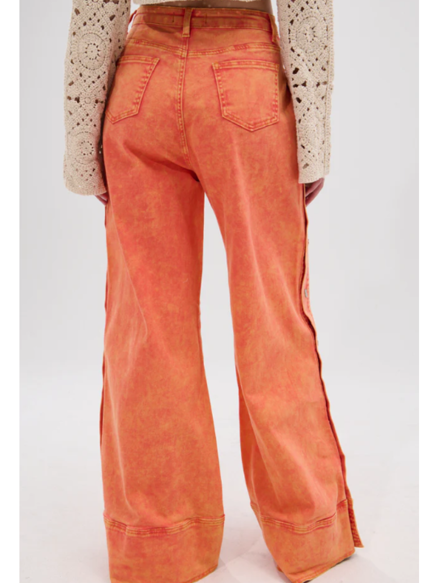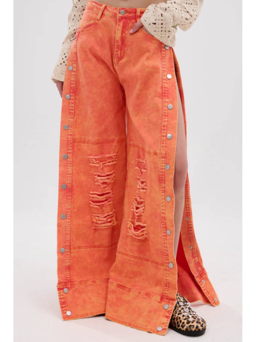 Elevate your wardrobe with some zesty denim. The Side Slit Ripped Jeans is a bold statement piece crafted from a bright orange, washed denim and features a high-rise fit, functional belt loops, a four-pocket design, ultra-ripped distressed detailing on the lower pant legs, full-length silver-tone snap buttons running down each side, and a front zip fly. Complete with a relaxed wide-leg silhouette. Pair with anything from a loose blouse to a cropped baby tee for an effortlessly cool finish.